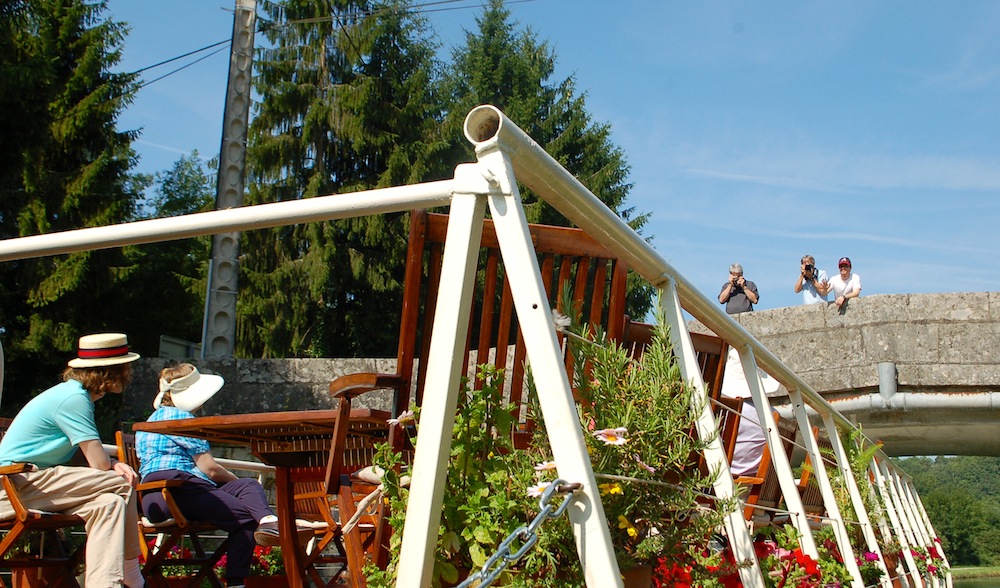 Luciole passes under a low bridge. Passengers duck, while others snap photos from above |