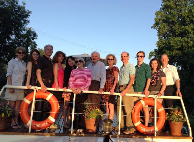We've had a very special family joining us this week celebrating the 58th wedding anniversary of Jon and Rebecca. Along with them are their three sons Jonathan, Ford and Steven, their wives Debbie, Fran and Betty, and their children Lara, Paige, Julia and Robert. A truly lovely family they were too, always smiling, ever talkative and constantly active and who can blame them for such activity in the sunshine we've had. It wasn't a surprise to see everyone out and off the boat so often during the day, cycling, walking and running around the countryside, exploring hidden places and finding things to do around the canal, even helping the lock keepers with the lock gates all day as we cruised along. It was also a very musical week as several passengers were talented musicians. Dinner most nights was ended with coffee and a sing along, the perfect accompaniment to a sunny evening with a dramatic sunset, and the perfect ending to an excellent week.